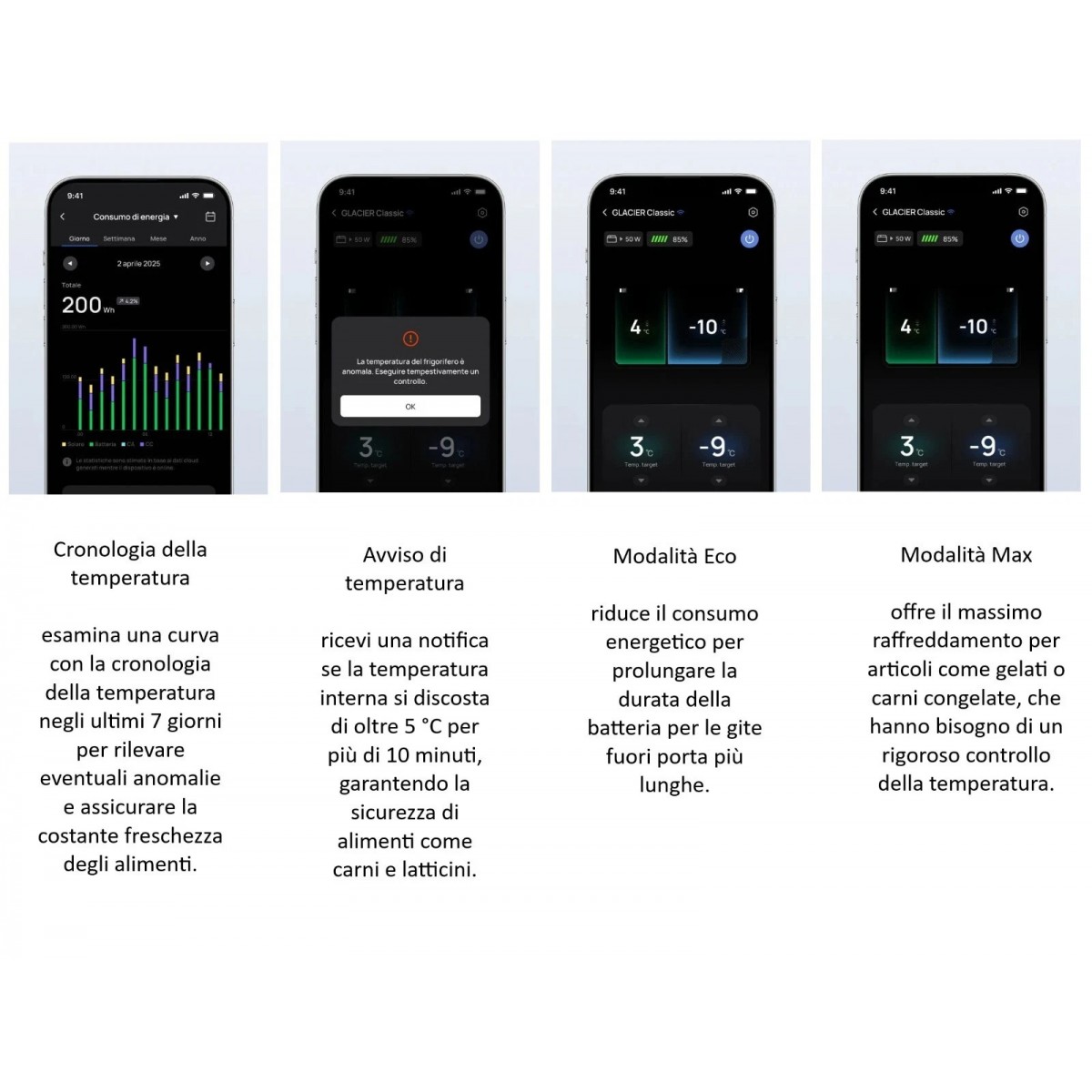 Accesso da APP : monitora controlla e personalizza GLACIER da remoto tramite l'app EcoFlow. Stato in tempo reale della batteria, avvisi per evitare perdite d'acqua, selezione della  modalità, arresti programmati. Tutto è a disposizione sul tuo telefono con pochi e semplici tocchi.